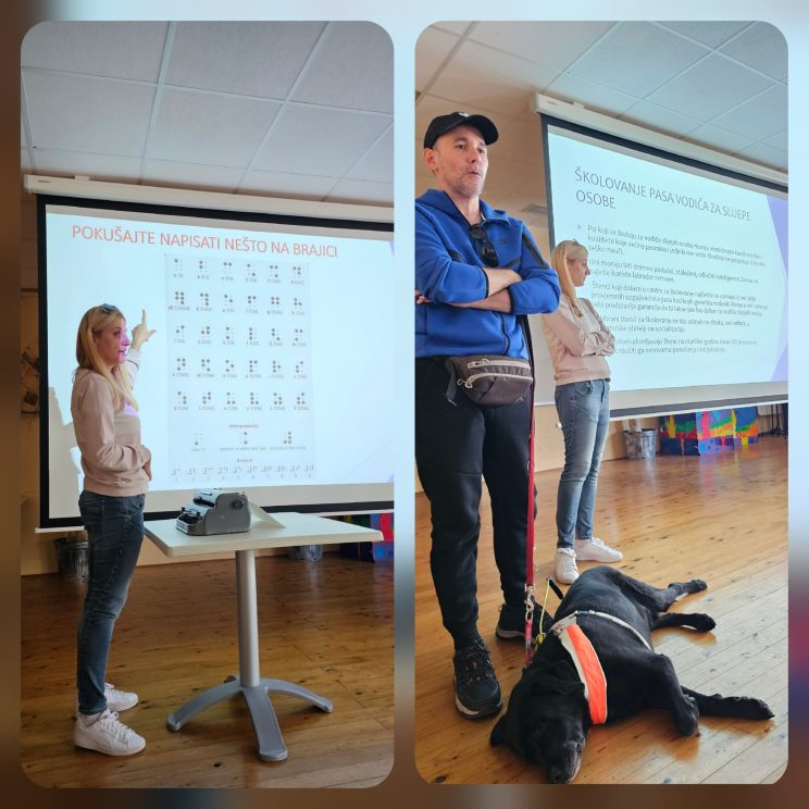 Ivan je dodatno oduševio učenike demonstracijom raznih vještina slijepih osoba, pokazao kako izgleda kretanje uz pomoć videće osobe i svog psa vodiča Voica