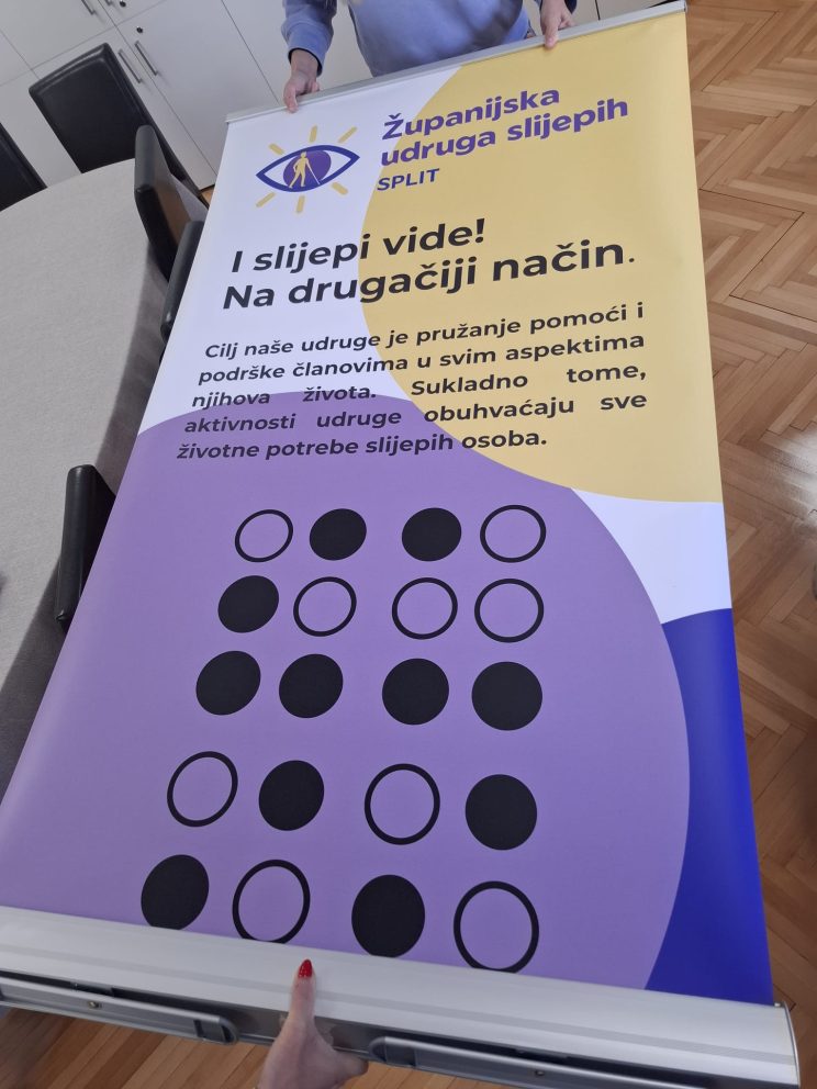 Županijska udruga slijepih Split s ponosom predstavlja svoj novi roll-up banner, izrađen u skladu s postojećim vizualnim identitetom te grafičkom knjigom standarda. Ovaj banner dio je naših stalnih nastojanja da unaprijedimo prepoznatljivost i profesionalnu prezentaciju udruge, kako u lokalnoj zajednici, tako i na nacionalnoj i europskoj razini.
