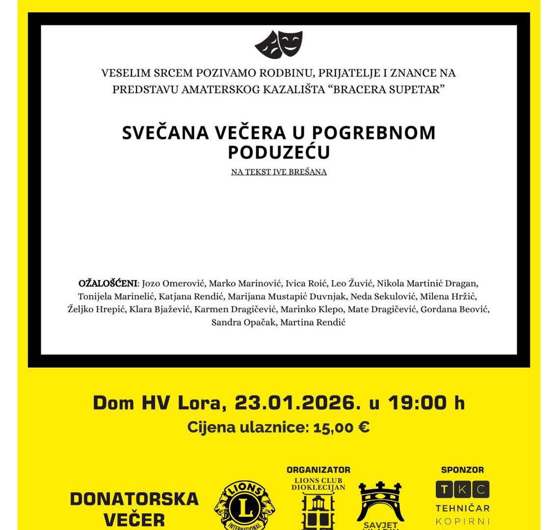 Županijska udruga slijepih Split poziva vas na humanitarnu kazališnu predstavu u korist naših članova. Predstavu izvodi Amatersko kazalište Bracera Supetar, prema tekstu Ive Brešana, pod naslovom „Svečana večera u pogrebnom poduzeću“.